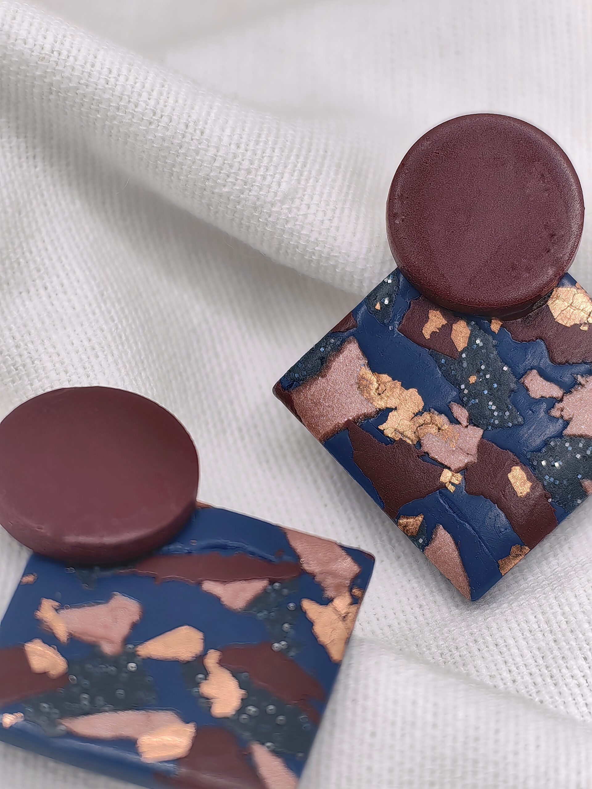 Χειροποίητα σκουλαρίκια από πολυμερικό πηλό σε τρία διαφορετικά σχήματα, φτιαγμένα με τεχνική terrazzo. Ελαφριά, άνετα και ιδανικά για καθημερινό ή πιο ιδιαίτερο στιλ. Συνδυάζουν βαθύ μπλε, μπορντώ και λεπτομέρειες από φύλλα ροζ χρυσού.