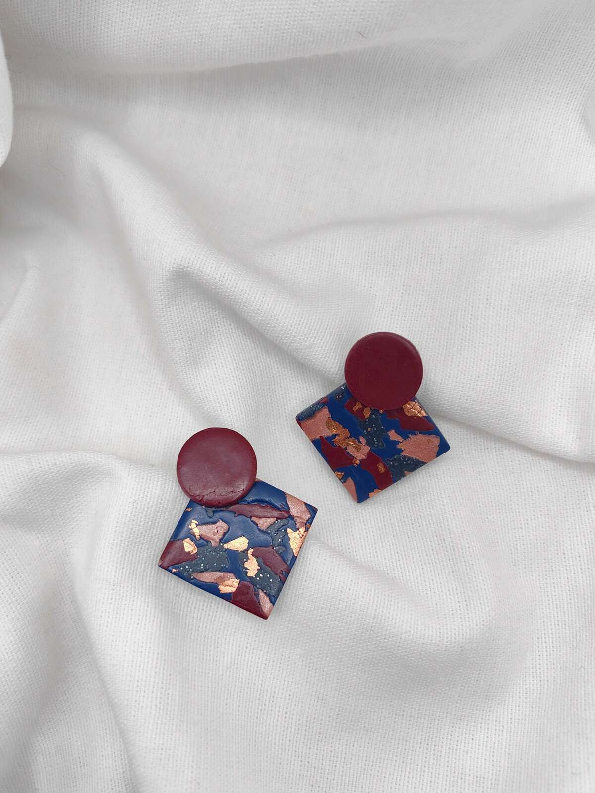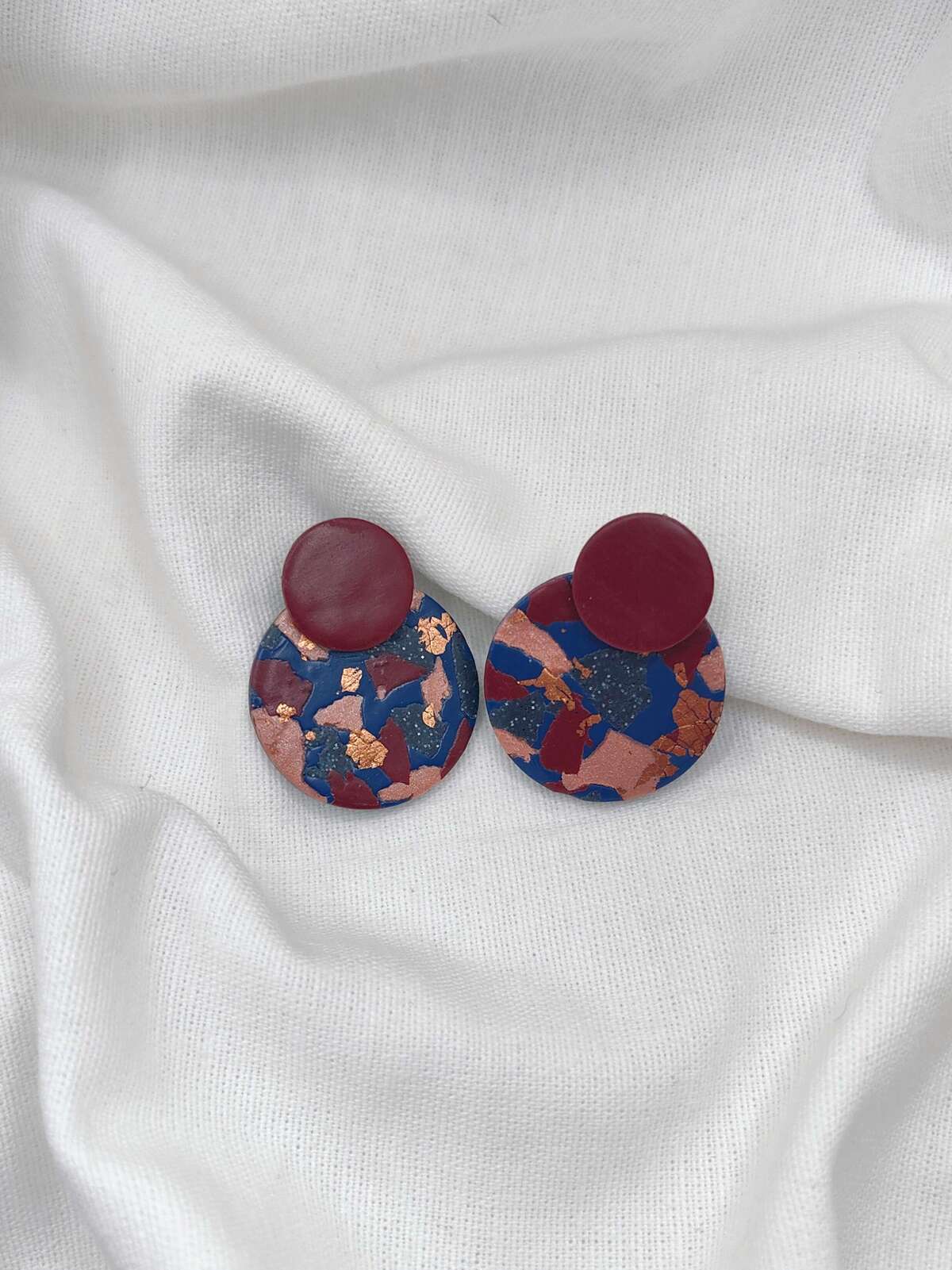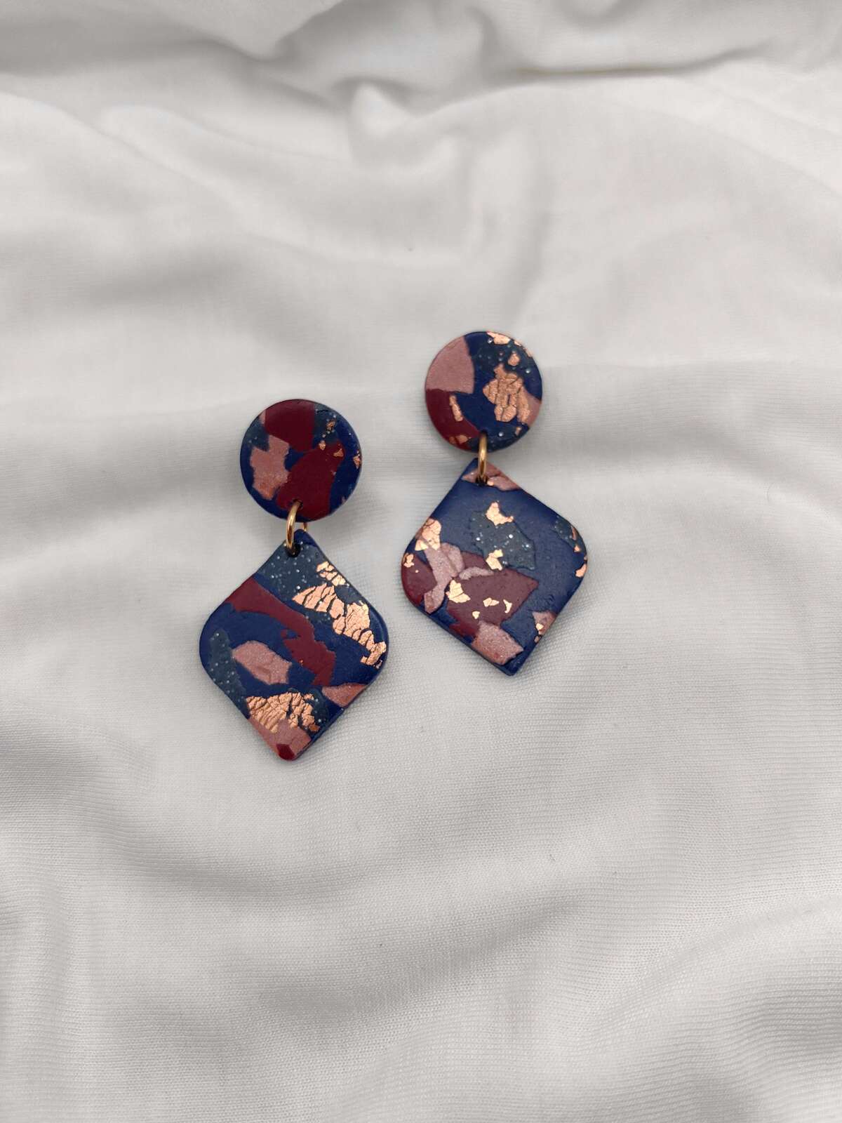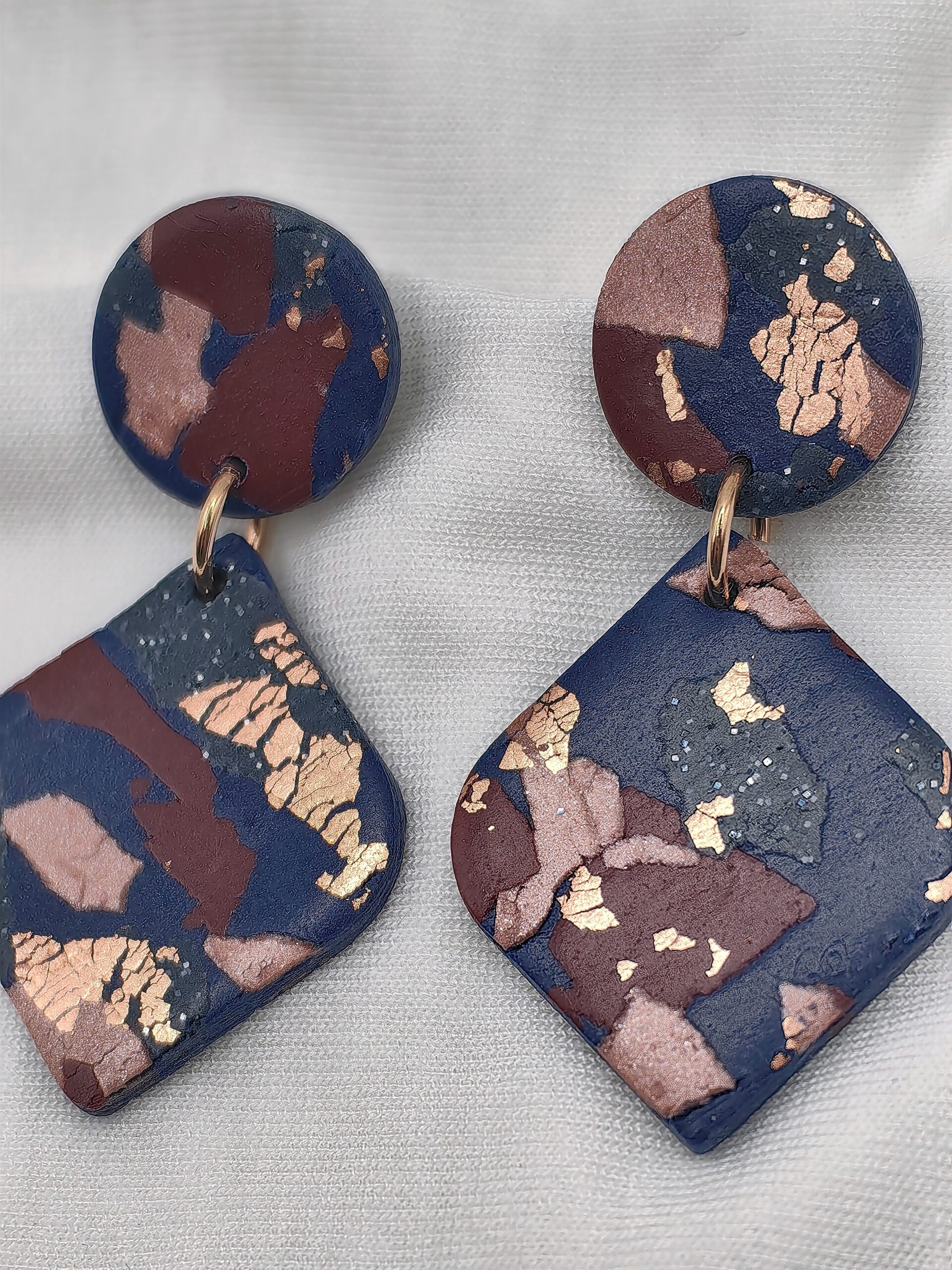 Χειροποίητα σκουλαρίκια από πολυμερικό πηλό σε τρία διαφορετικά σχήματα, φτιαγμένα με τεχνική terrazzo. Ελαφριά, άνετα και ιδανικά για καθημερινό ή πιο ιδιαίτερο στιλ. Συνδυάζουν βαθύ μπλε, μπορντώ και λεπτομέρειες από φύλλα ροζ χρυσού.