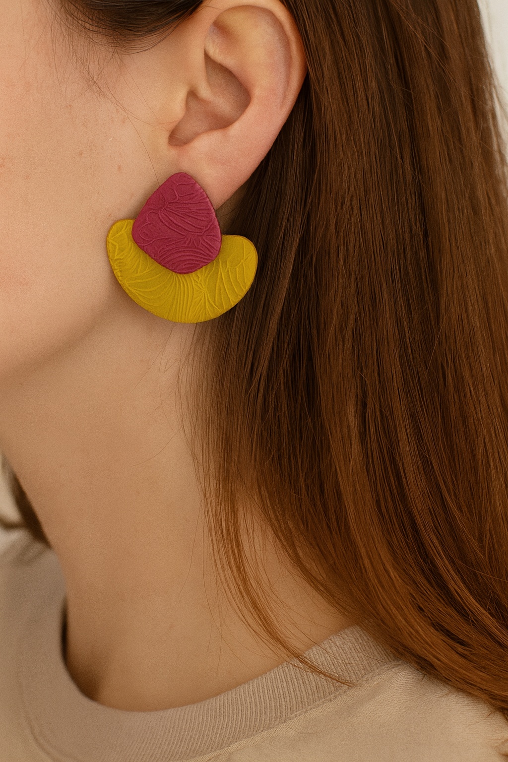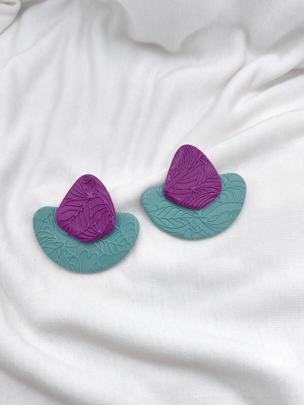 Χειροποίητα σκουλαρίκια από πολυμερικό πηλό σε συνδυασμό 2 ιδιαίτερων χρωμάτων, με ανάγλυφο φυλλώδες μοτίβο που προσθέτει υφή και καλλιτεχνική αισθητική. Διαθέτουν καρφάκια από ανοξείδωτο ατσάλι, υποαλλεργικά και κατάλληλα για ευαίσθητα αυτιά. Είναι ιδιαίτερα ελαφριά και άνετα, ώστε να φοριούνται όλη μέρα χωρίς να βαραίνουν το αυτί.