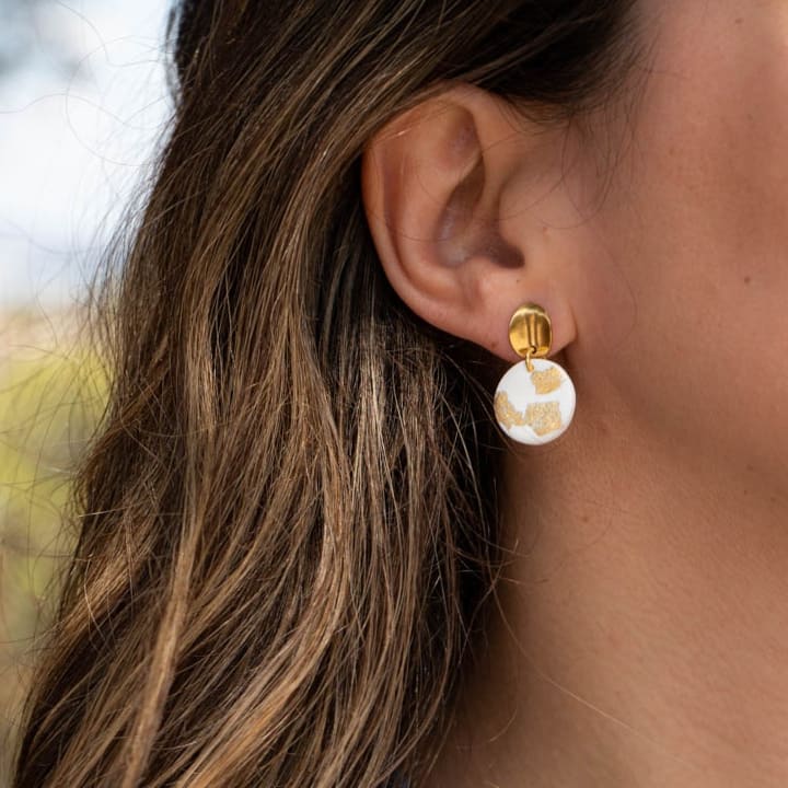 Χειροποίητα σκουλαρίκια από πολυμερικό πηλό με λεπτομέρεια από φύλλα χρυσού. Μικρά και διακριτικά με ατσάλινα καρφάκια, ιδανικά για όσες προτιμούν λιγοτερο έντονα αξεσουάρ.