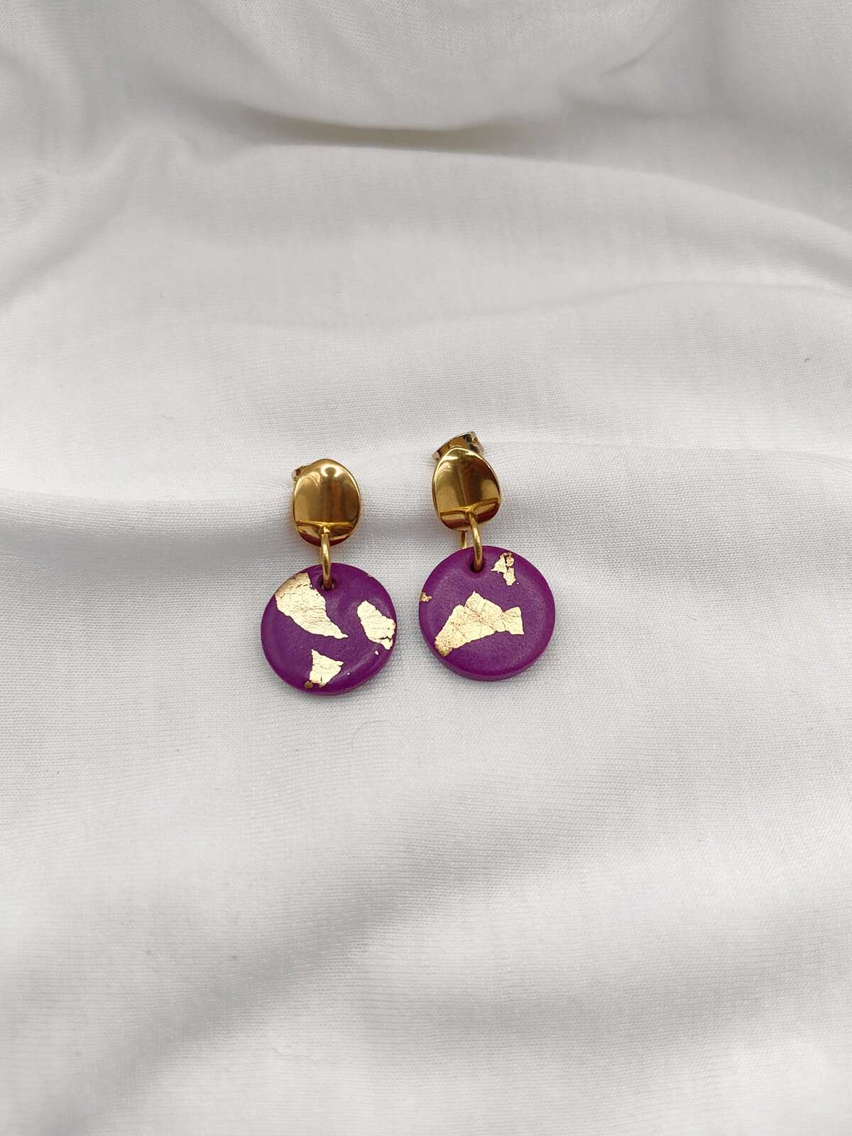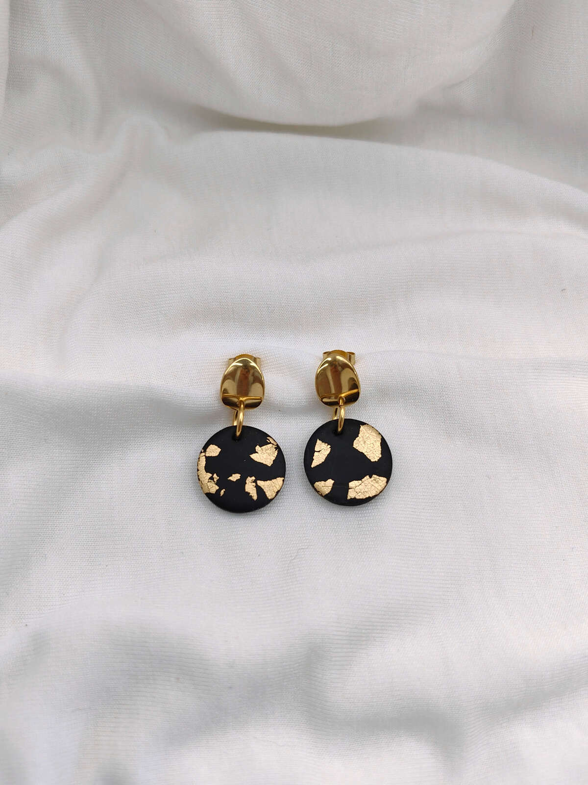 Χειροποίητα σκουλαρίκια από πολυμερικό πηλό με λεπτομέρεια από φύλλα χρυσού. Μικρά και διακριτικά με ατσάλινα καρφάκια, ιδανικά για όσες προτιμούν λιγοτερο έντονα αξεσουάρ.