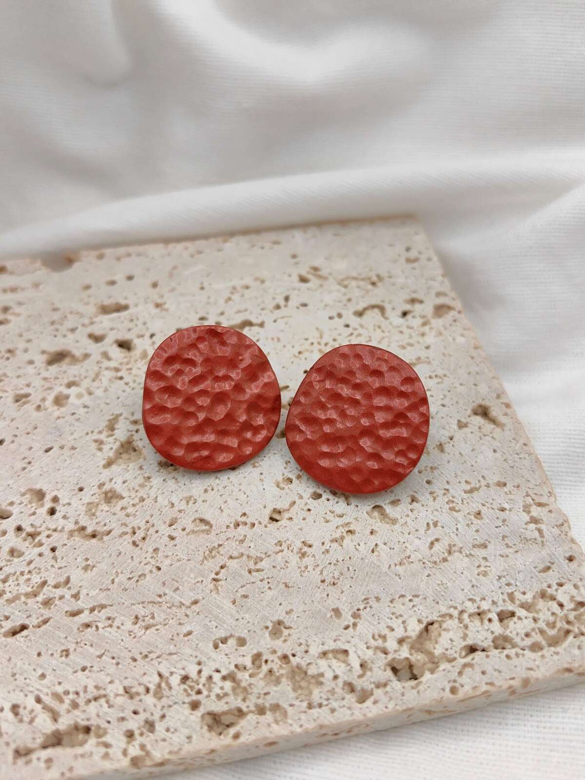 Σκουλαρίκια σε λιτό αλλά ιδιαίτερο κυκλικό σχήμα, στο χρώμα του χαλκού και με μια τεχνική που θυμίζει σφυρήλατο. Διαθέτουν καρφάκια από ανοξείδωτο ατσάλι, υποαλλεργικά και ασφαλή για ευαίσθητα αυτιά. Είναι πολύ ελαφριά, ιδανικά για άνετη καθημερινή χρήση χωρίς να βαραίνουν το αυτί.