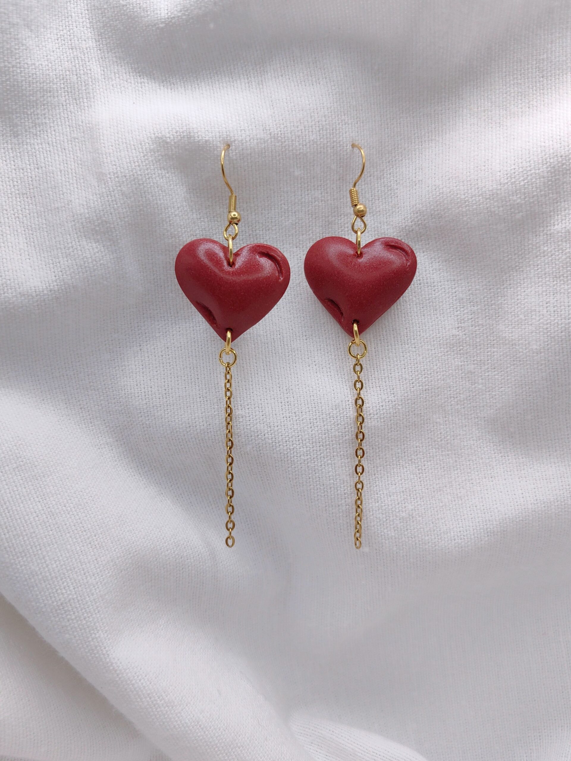 Χειροποίητα σκουλαρίκια με καρδιές μπαλόνι σε λευκό χρώμα της πέρλας από πολυμερικό πηλό και ατσάλινη αλυσίδα σε χρυσό χρώμα που κρέμεται διακριτικά. Ένα ιδιαίτερο κόσμημα που δίνει ένταση και κλέβει την παράσταση.